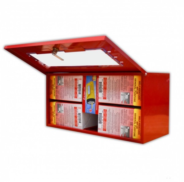 Контейнер для хранения самоспасателей промышленных изолирующих СПИ-20 на 4 изделия. Контейнер предназначен для удобного хранения в зданиях и сооружениях, и оперативного получения средств защиты и спасения. Контейнер поставляется в красном или белом цвете (по желанию заказчика) с окном из оргстекла, колодочным замком и отверстием для опломбирования. Также предусмотрено место для фонарика.